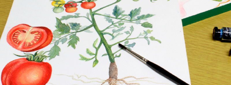 En primer lugar, explicaremos en profundidad la técnica de la acuarela: composición, diferentes calidades, marcas del mercado… A través de una ilustración botánica aprenderemos técnicas básicas para aplicar la acuarela. Además, conoceremos cómo representar las partes de una planta, ya sean sus hojas, raíces, tallos o frutos.